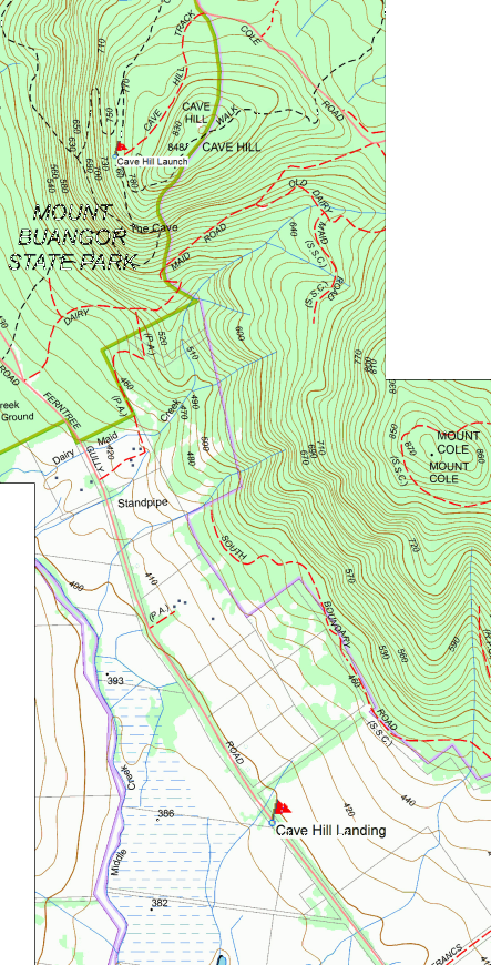 Go along Mount Cole Road. Turn left onto Cave Hill track. Go 1 km to car park. Launch is 90m from car park to right.