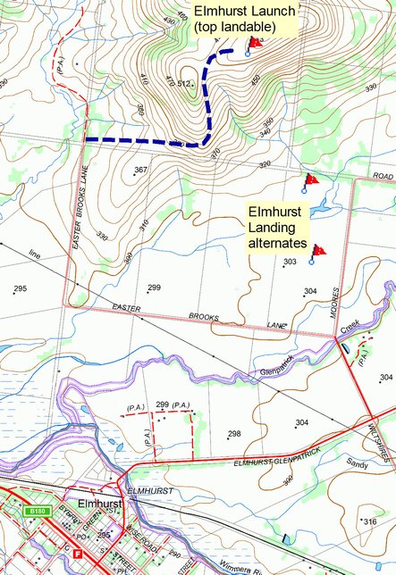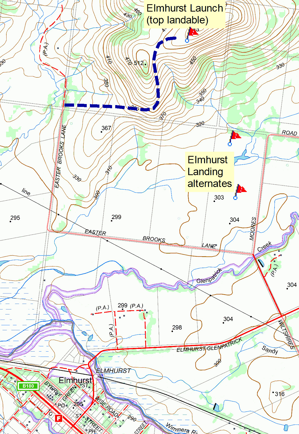 This site is usually flown when the wind at Buangor is too strong or too far off to the SE. The wind at Elmhurst is usually lighter than at Buangor because it is sheltered by Ben Nevis and Mount Lonarch. Cross country flights are possible from this site when the wind and thermal conditions are suitable.