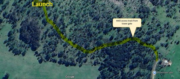 After the intersection with Freeman Rd at (-37.1257, 145.1785) , go through a closed gate with a code lock and follow a good track to an unlocked gate at the radio tower. Track from the radio tower to the launch is passable for a high-clearance 2WD in dry conditions, 4WD when wet. Driving to the launch in winter is discouraged (due to wet, soft track).