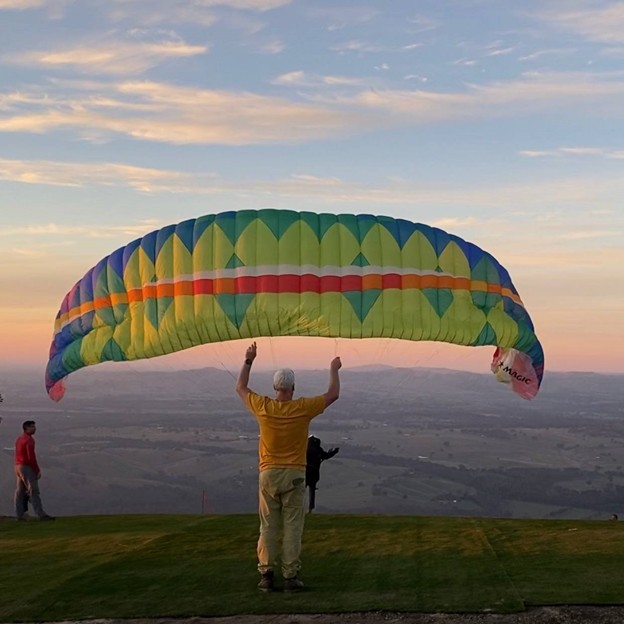 Paraglider and Hang Glider. NNE facing takeoff tree slot launch, wide enough for a single glider, new astroturf has been installed in May 2024 which gives a wider and cleaner launch area.