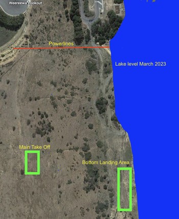 Land anywhere on the lake that is dry. However, currently (2023) the lake is full and hence landing is confined to the flat, dry area shown in the image below. Do not fly the site if you are not confident in landing in a small space cross wind at the bottom of the slope. If you cross Geary’s Gap across the highway and head north there are also very limited landing options if the wind strength decreases and you can’t return to top land. There are currently no safe landing options south of the first rest stop.