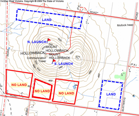 From Melbourne, travel on the Western Highway. Turn north at the Midland Hwy outside of Ballarat. Nearest Town: Creswick. Please close the gates as there is usually cattle in the paddocks. (Or leave them as you found them) Ballarat registered aerodrome is 5NM to the south of launch. CTAF 127.75. VHF must be used. Navigate to Millers Rd entry gate